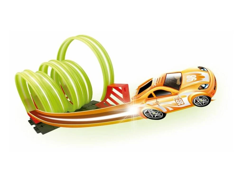 Incluye: 1 Circuito de Loopings que brilla en la oscuridad y 1 coche de color fosforescente con sistema de impulso y luces.