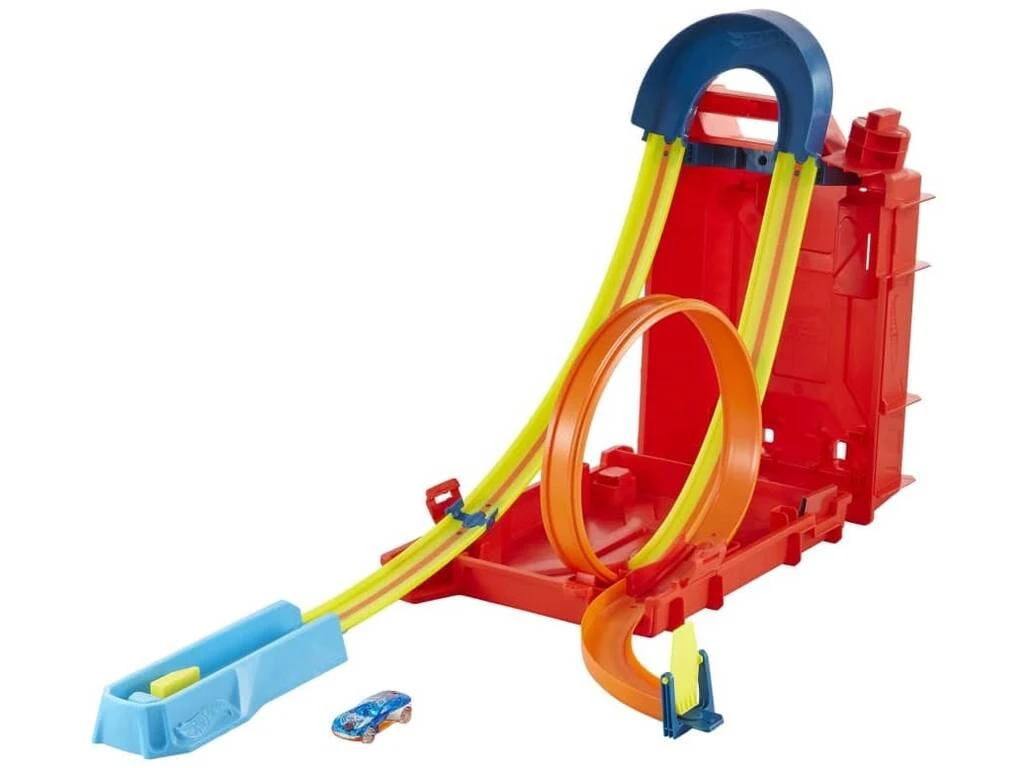 Incluye: 1 vehículo Hot Wheels de color azul, plateado y naranja y 1 playset de acrobacias con forma de bidón, rampas, looping, lanzador y más zonas de juego.