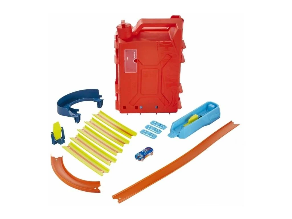 ¡Llena tu depósito de energía y prepárate para la aventura! ¡Con este Hot Wheels Track Builder Caja de Acrobacias en Forma de Bidón de Mattel!