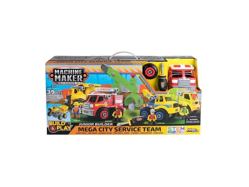 Incluye: 1 camión de bomberos, 1 grúa, 1 camión de la basura, 1 camión volquete, 1 grúa, 4 figuras para los vehículos, 1 destornillador y 2 rocas.