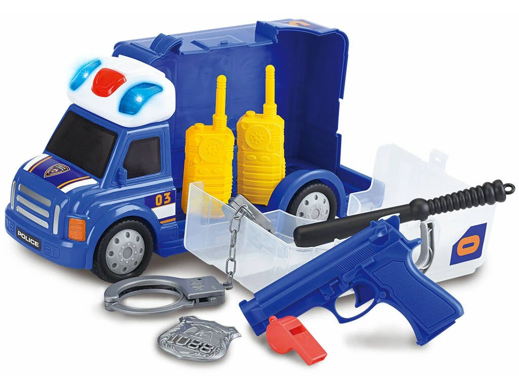 Incluye: 1 maletín camión de policía con luces y sonidos, 1 pistola con sonidos, 1 esposas, 1 silbato, 1 placa, 1 porra y 2 walkies.