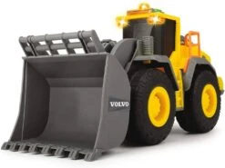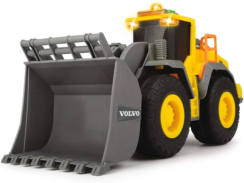 Incluye: 1 camión volquete Volvo con luz y sonido, pala articulada, ruedas de plástico y detalles realistas.