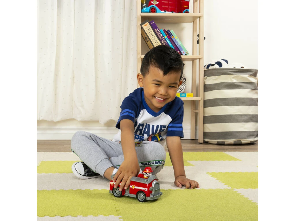 Incluye: 1 figura de acción Marshall con cabeza articulada y traje rojo y 1 vehículo Fire Engine con cabina para la figura y escalera móvil.