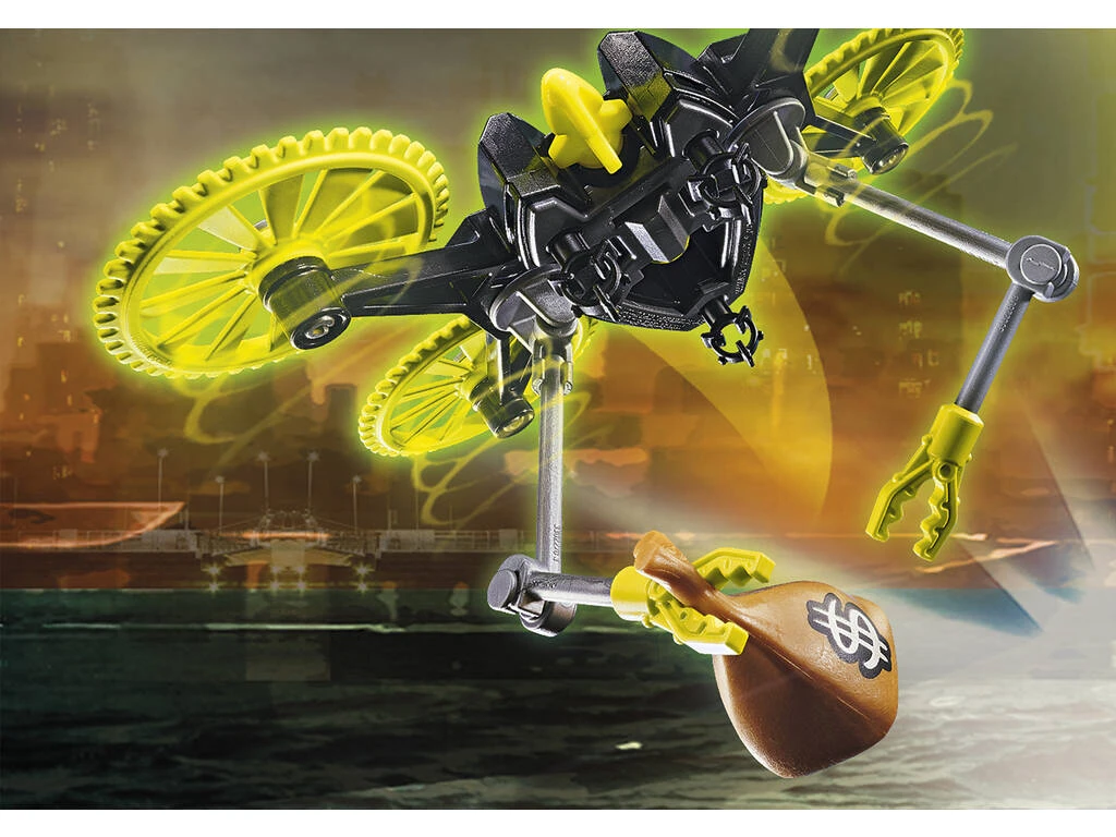 Consigue este impresionante set que incluye todo lo que necesitas para recrear una persecución por aire sin igual. Ayuda al valiente policía a dar caza al hábil ladrón de bancos, que huye sobre su potente dron con pinzas y lanza proyectiles.