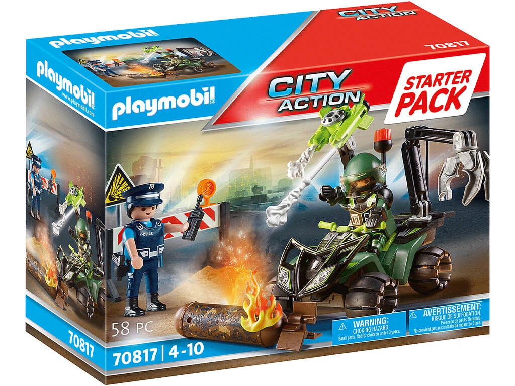 Incluye: 1 figura policía con chaleco y gorro, 1 figura experto de desactivación de bombas con casco y traje especial, 1 quad con brazos especiales para bombas, 1 proyectil antiguo, 1 barrera, 1 pistola, 1 par de guantes, 1 llama y más accesorios de juego.