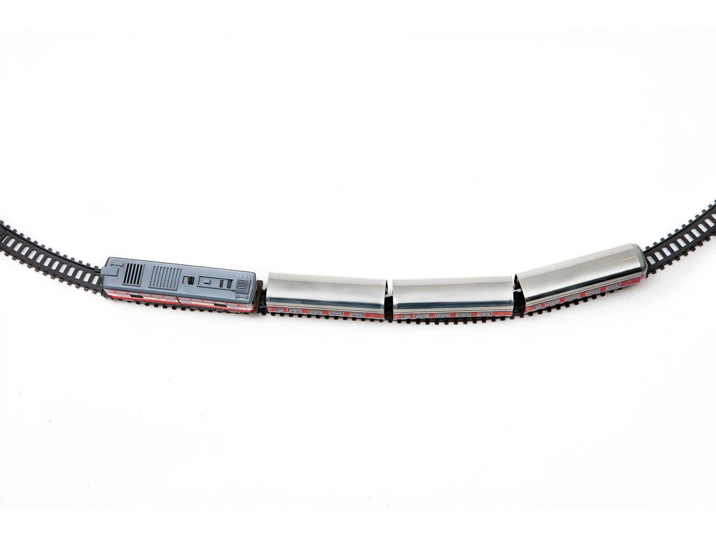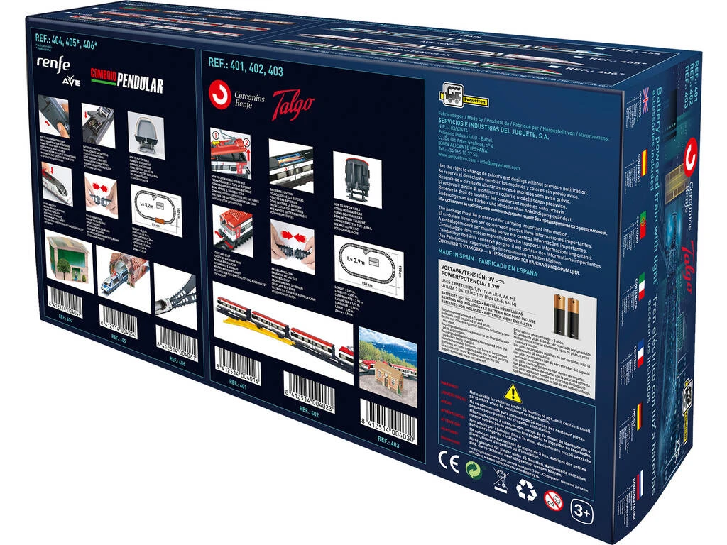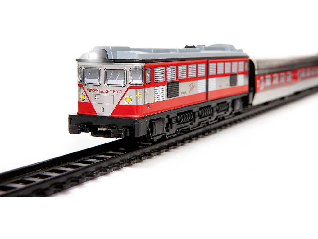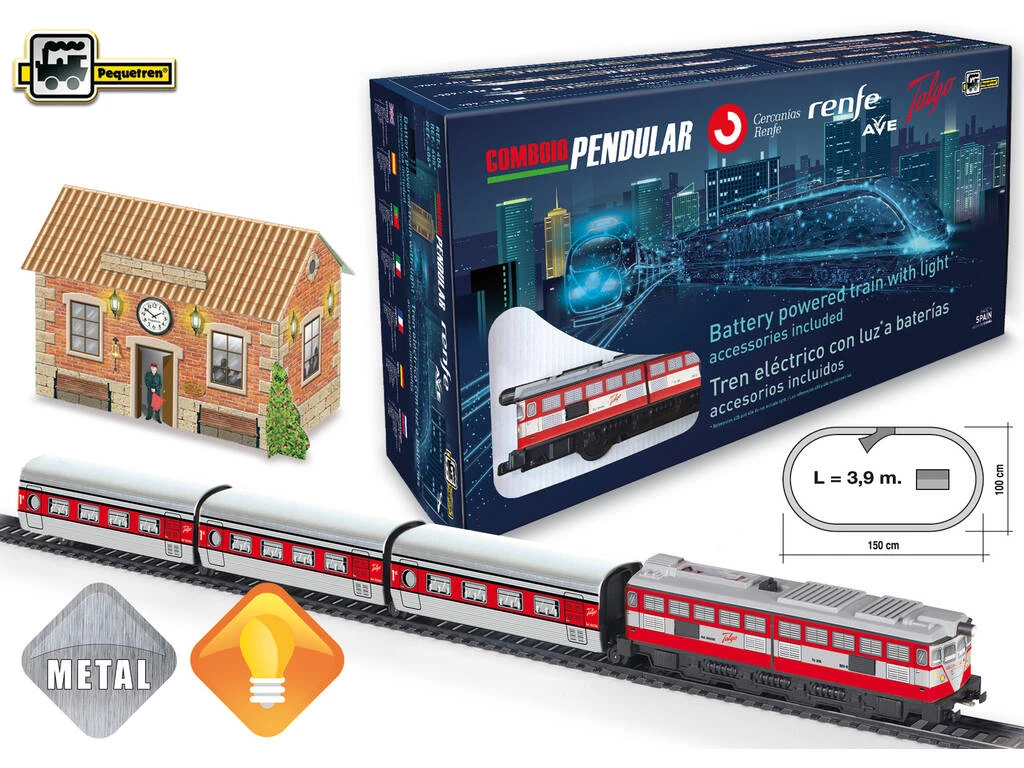 Incluye: 1 caja de almacenaje, 1 locomotora eléctrica a batería Talgo de color roja y plateada con luz, 2 vagones, 1 locomotora de cola sin motor, 16 vías curvas, 11 vías rectas, 1 estación, 1 encarrilador y 1 túnel.